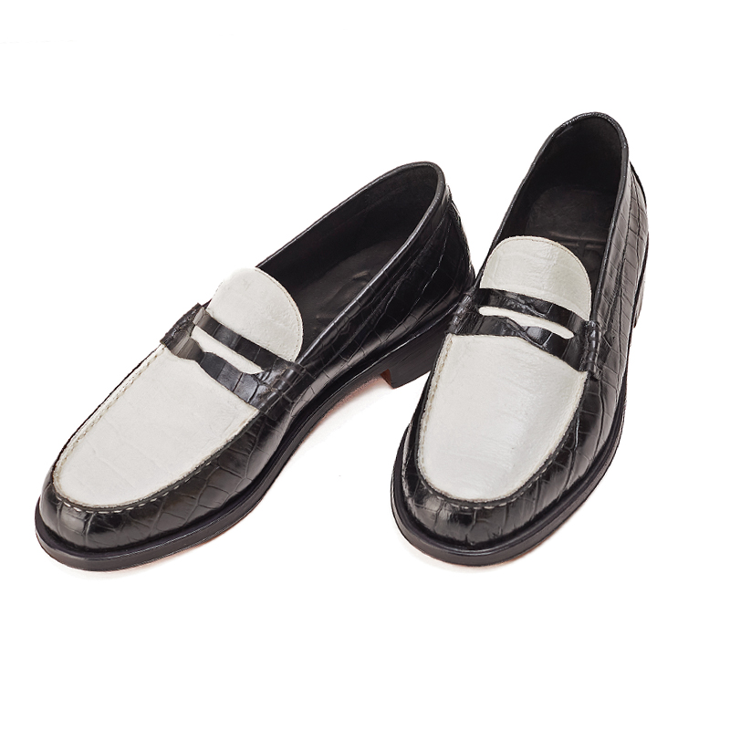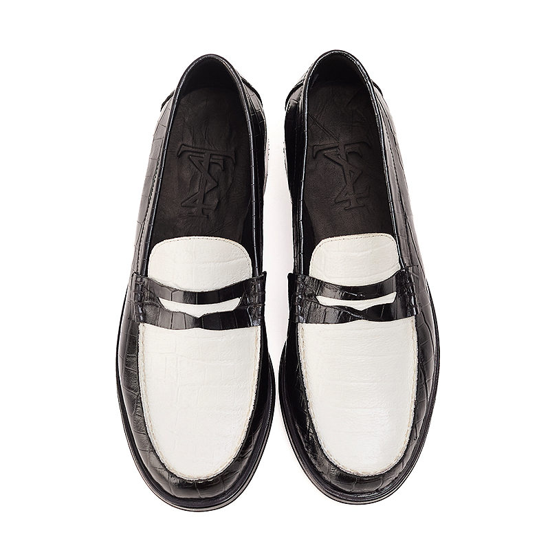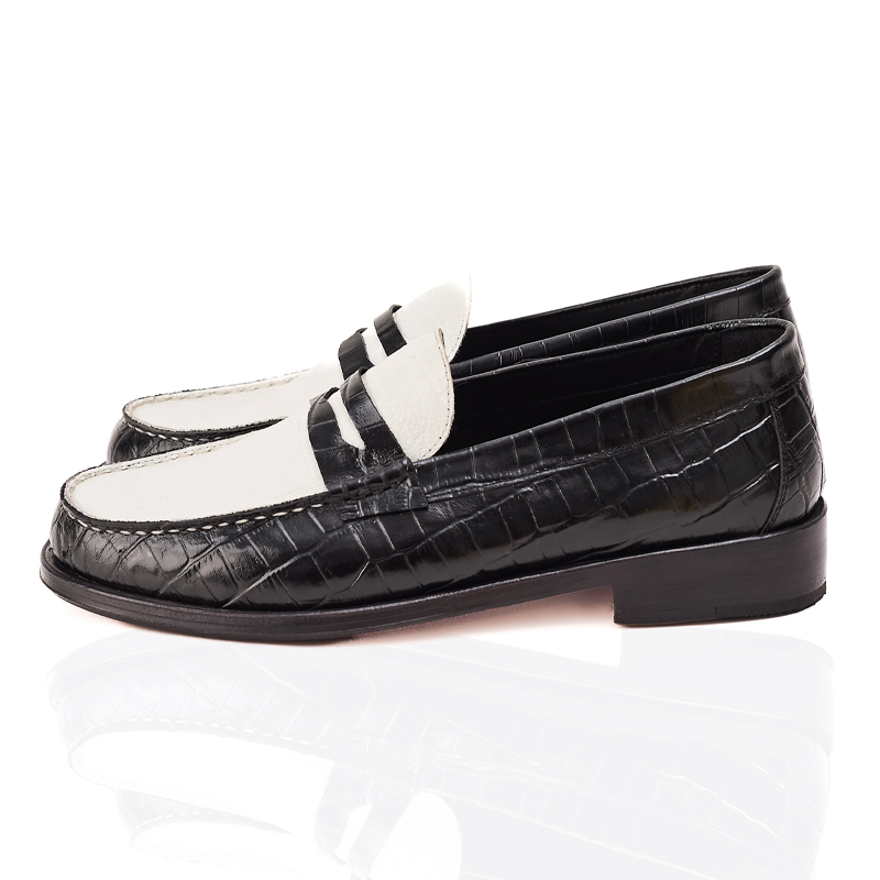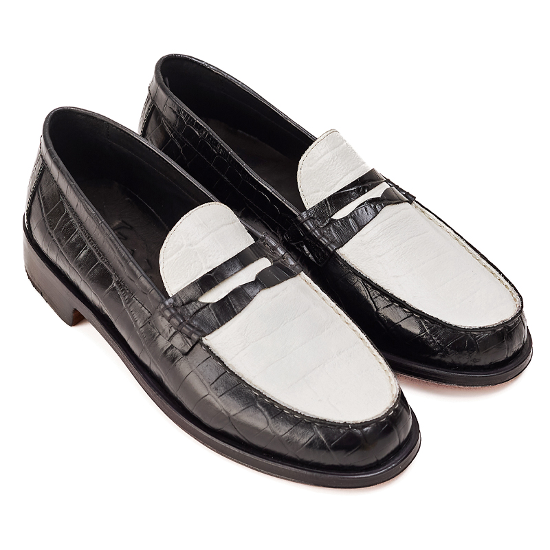 Mocasín legítimo con vincha, combinados en cueros croco blanco y negro. Suela de cuero cosida a Blake.